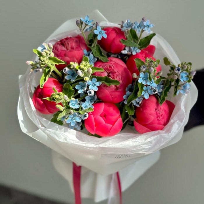 Пион – 7 шт.Оксипеталум – 6 шт.Упаковка дизайнерская – 1 шт.Средство продления жизни цветка – 1 шт.любовь флориста (бесплатно) – 100500 шт.
