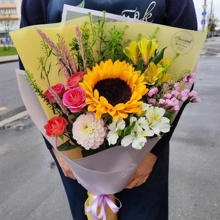 АНАСТАСИЯ солнечный букет из подсолнухов и ромашек