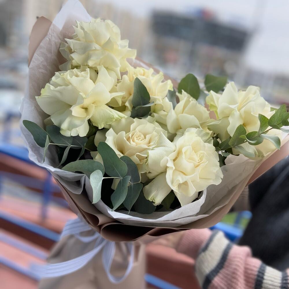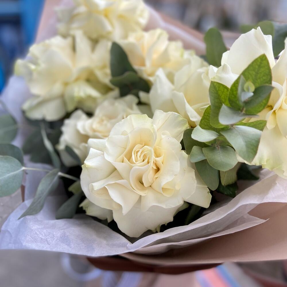 Букет из белых французских роз с эвкалиптом