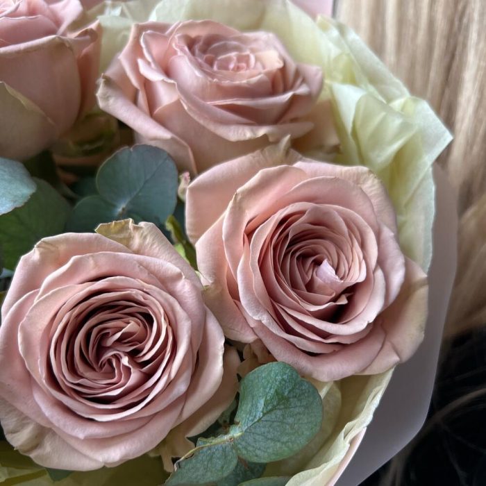 Роза мокко – 5 шт.Эвкалипт – 4 шт.Упаковка дизайнерская – 1 шт.Лента атласная – 1 шт.