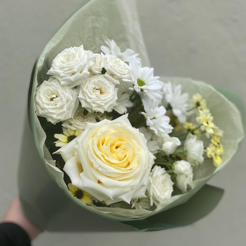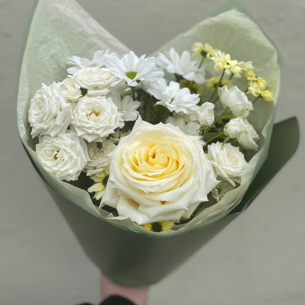 роза сорта кендилайт – 1 шт.Хризантема кустовая – 1 шт.Роза кустовая белая – 2 шт.Хризантема Сантини – 2 шт.