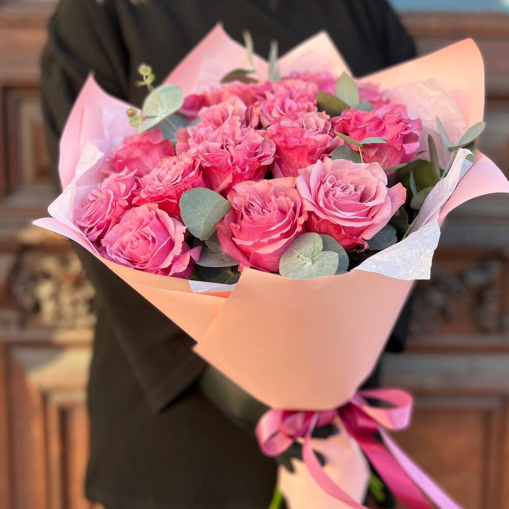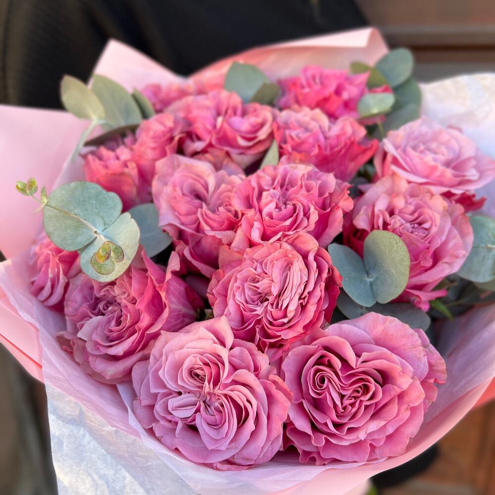 Эвкалипт – 3 шт.Лента атласная – 2 шт.Тишью – 3 шт.Пленка матовая – 3 шт.роза пионовидная кантри блю – 15 шт.