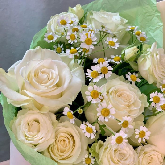 Роза кустовая – 2 шт.Рускус – 3 шт.Роза Эквадор – 7 шт.Матрикария – 2 шт.Упаковка дизайнерская – 2 шт.