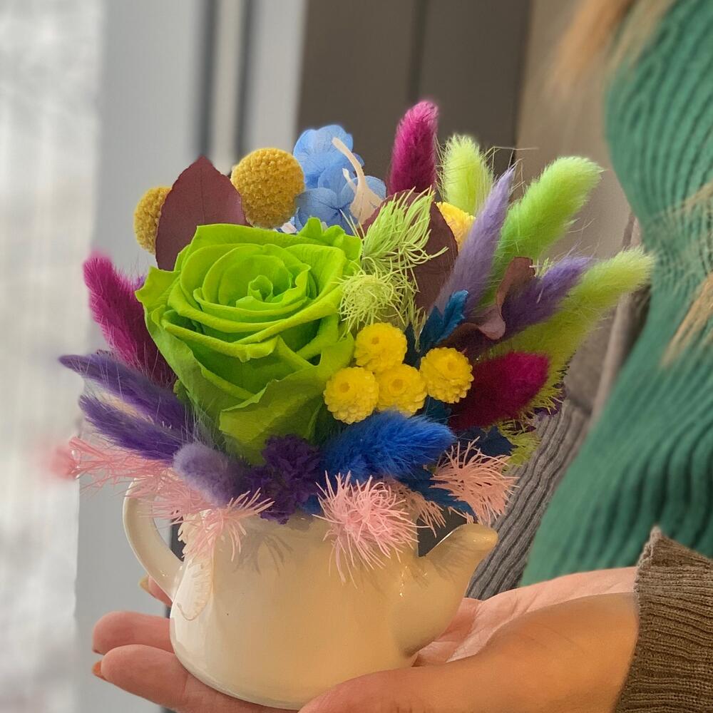 Сухоцветы – 15 шт.Роза стабилизированная – 1 шт.Лагурус (сухоцвет) – 25 шт.Краспедия желтая – 3 шт.